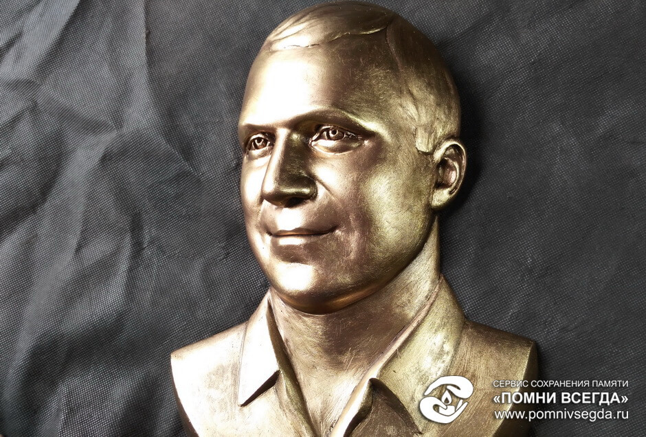 Передаём гипсовый барельеф на отлив, который происходит методом гальванопластики. Получившийся в итоге медный портрет не подвержен коррозии, а поэтому сохранит лицо покойного очень и очень долгое время. Со временем медь потускнеет, однако, это лишь придаст барельефу естественность и дороговизну.