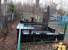 Так выглядит место захоронения во время промежуточного этапа работы: бетонный цоколь облицован гранитом, массивное надгробье установлено на своё новое место.