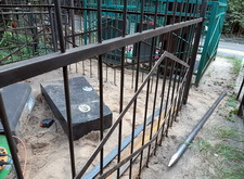В данном заказе нам предстояло облагородить уже существующую могилу, на которой сравнительно недавно происходило дозахоронение. Уже установленный на участке памятник практически полностью упал – хозяева даже привязали его к ограждению. В остальном могила выглядела чисто и ухоженно.